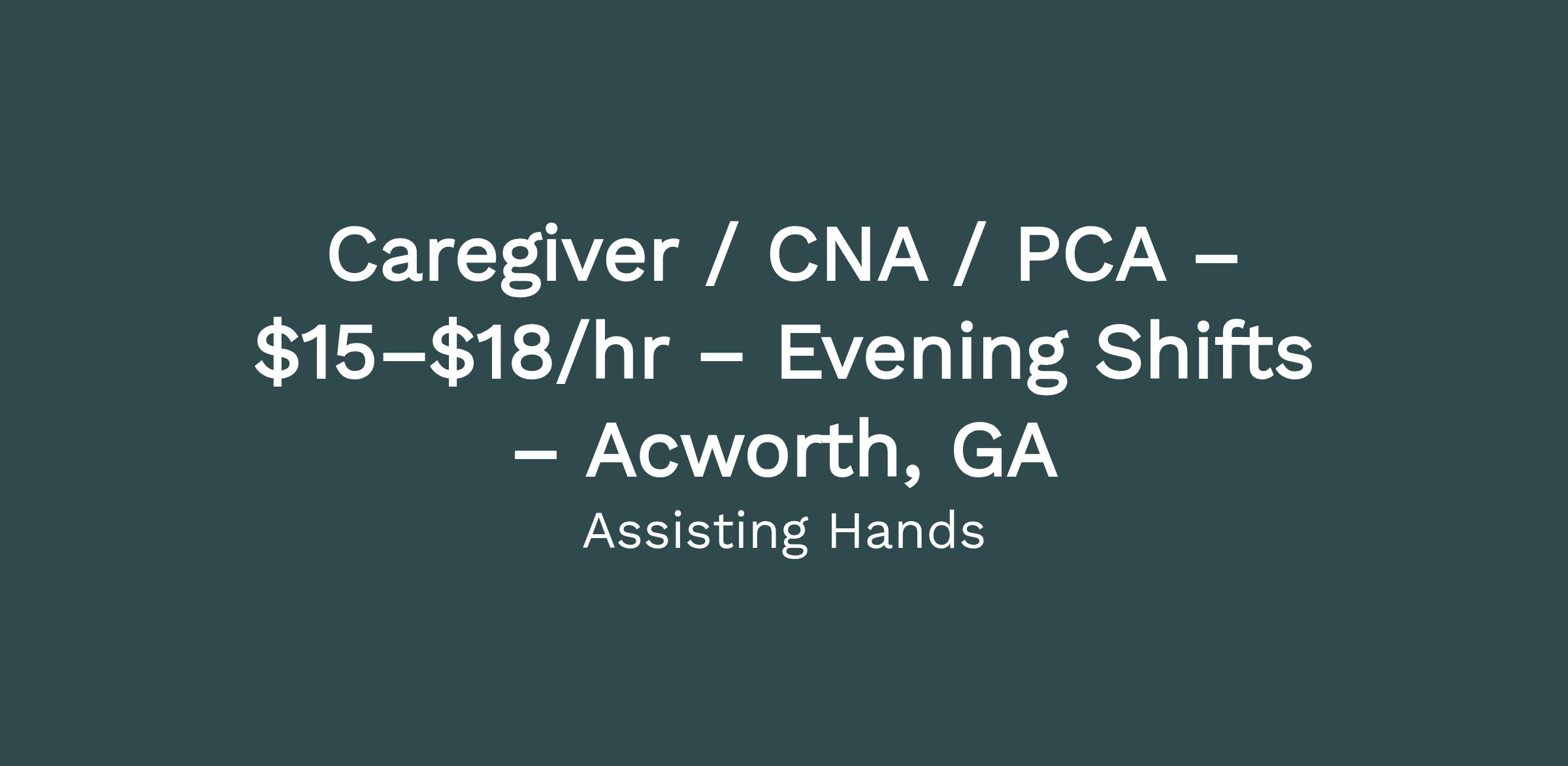 Assisting Hands Home Care is hiring compassionate Caregivers, CNAs, and PCAs for consistent evening shifts in the Acworth and Cartersville area. This role is ideal for caregivers looking for reliable after-work or second-shift hours.