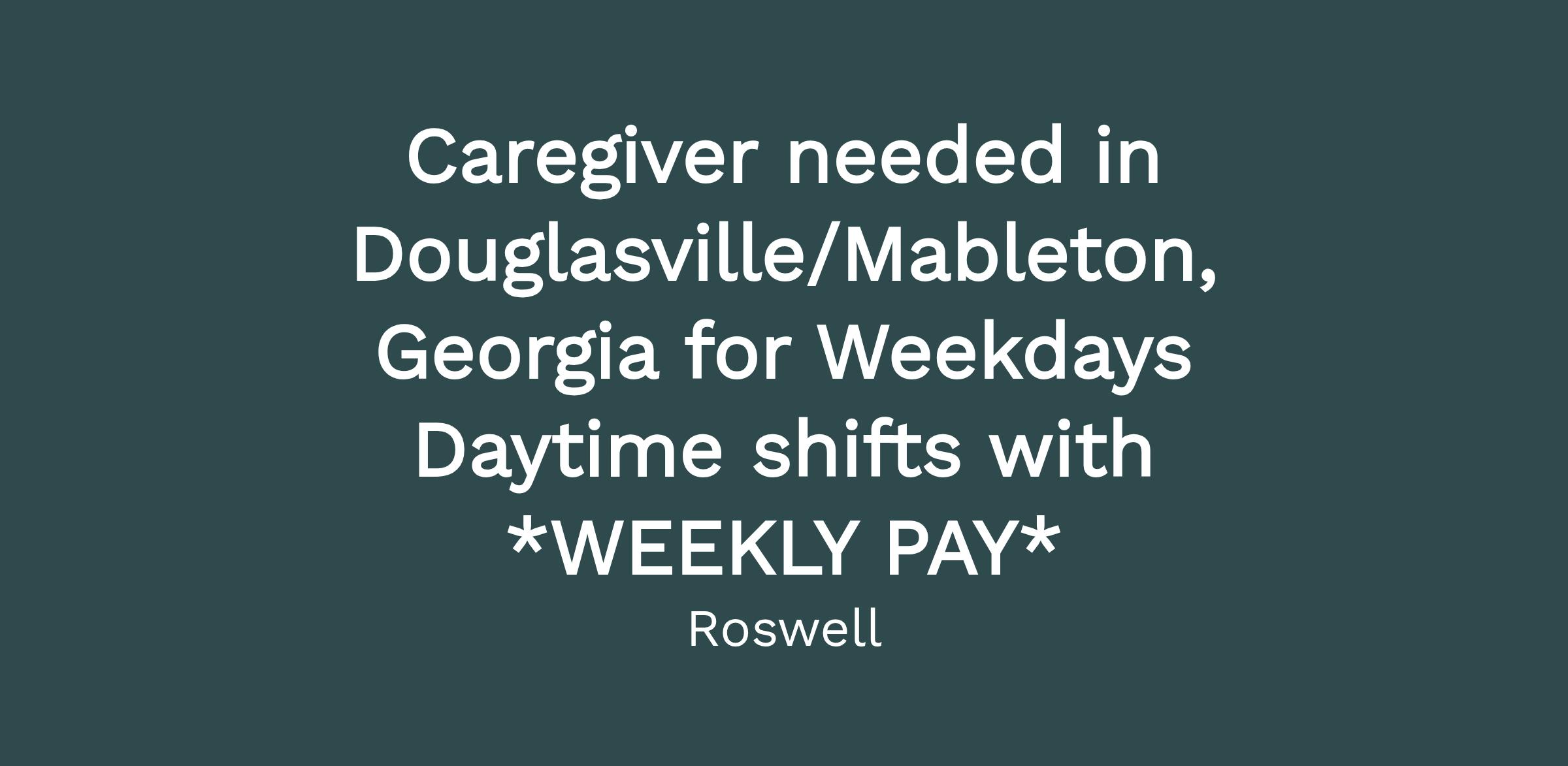 Caregiver needed in Douglasville / Mableton, Georgia for Weekdays Daytime shifts with *WEEKLY PAY*