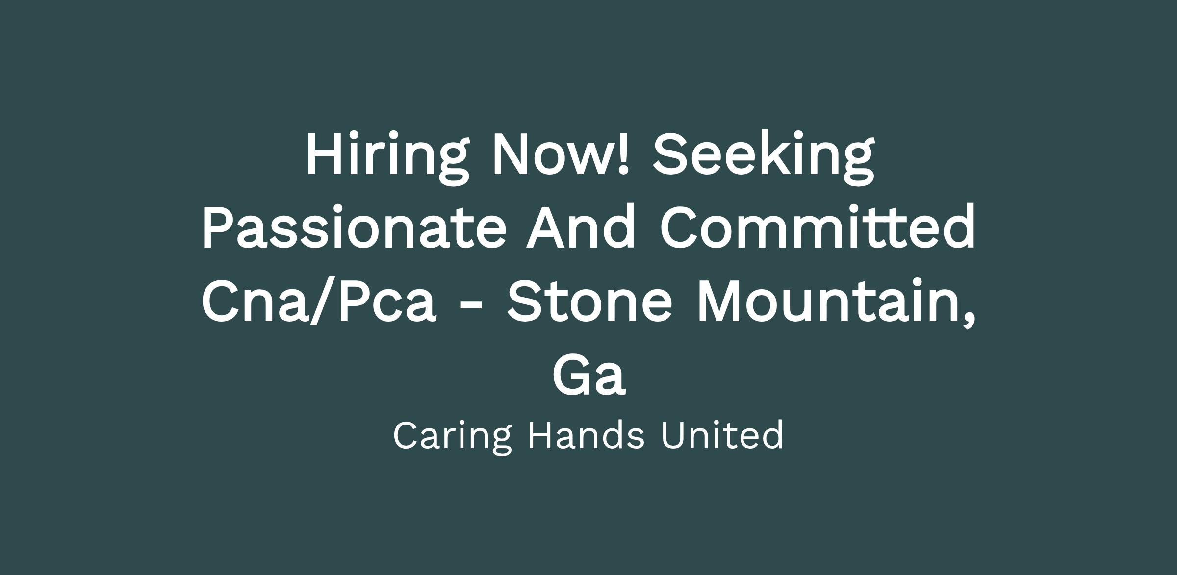 Caring Hands United Inc, is seeking compassionate a Part Time CNA/PCA in the Stone Mountain, GA area to work within our client's homes providing support with daily living tasks and personal care under the supervision of a Registered Nurse and Staffing Coordinator. Must be able to travel to one or more client locations in the community and perform assigned direct care activities, basic personal care procedures, and training for clients in the community. We offer excellent wages, benefit, and flexible scheduling.